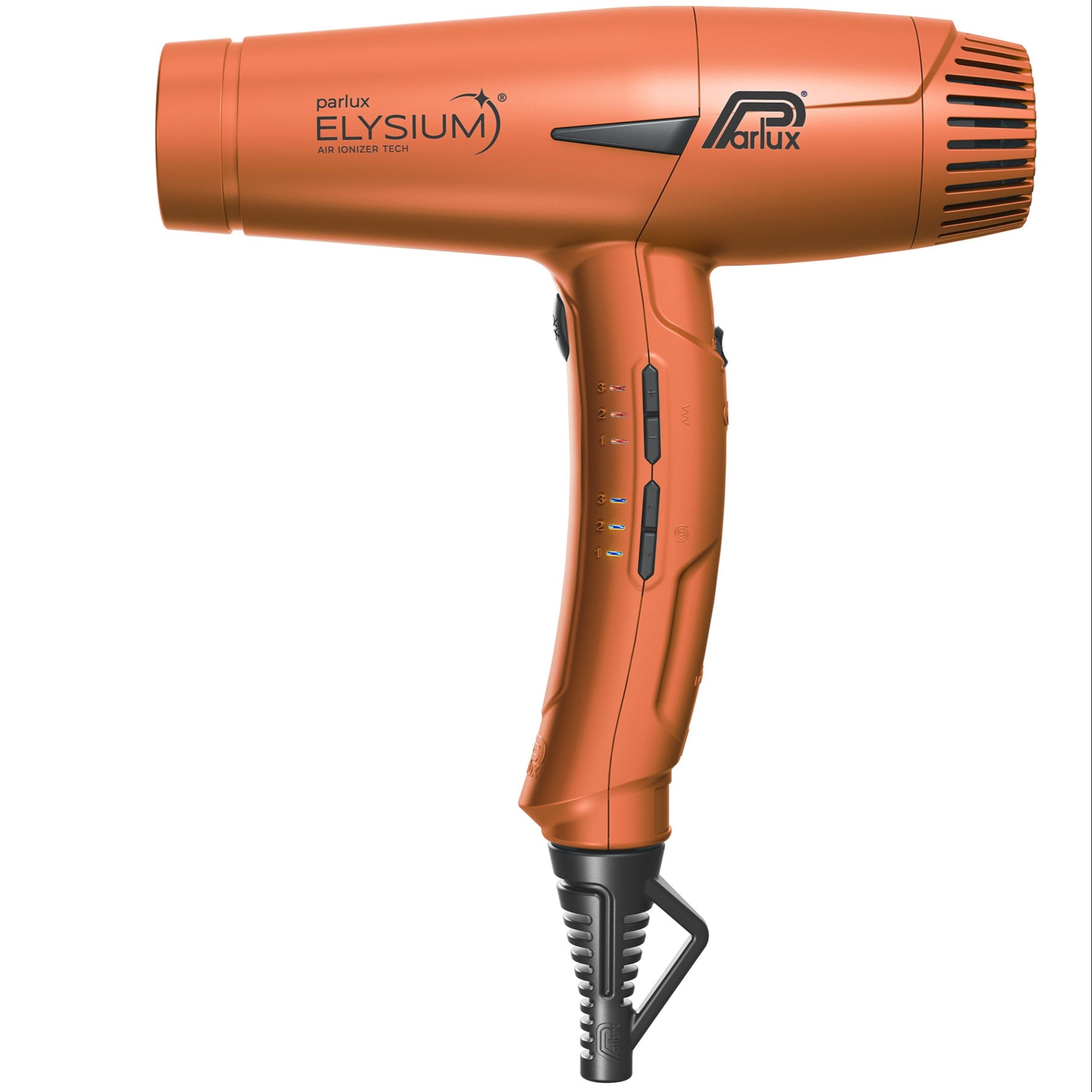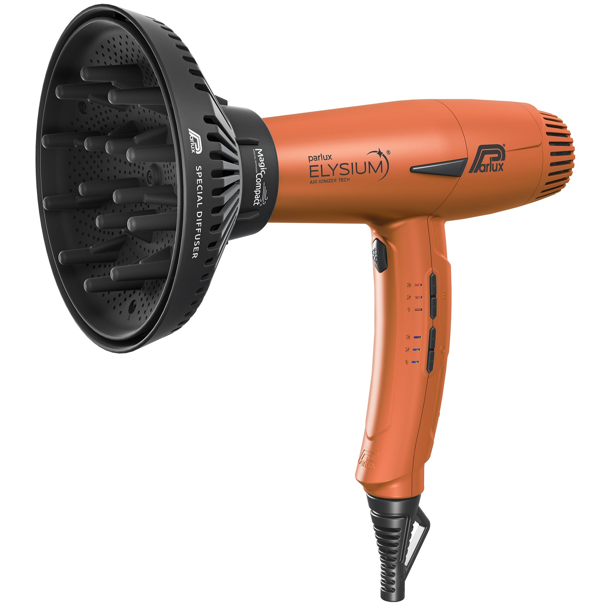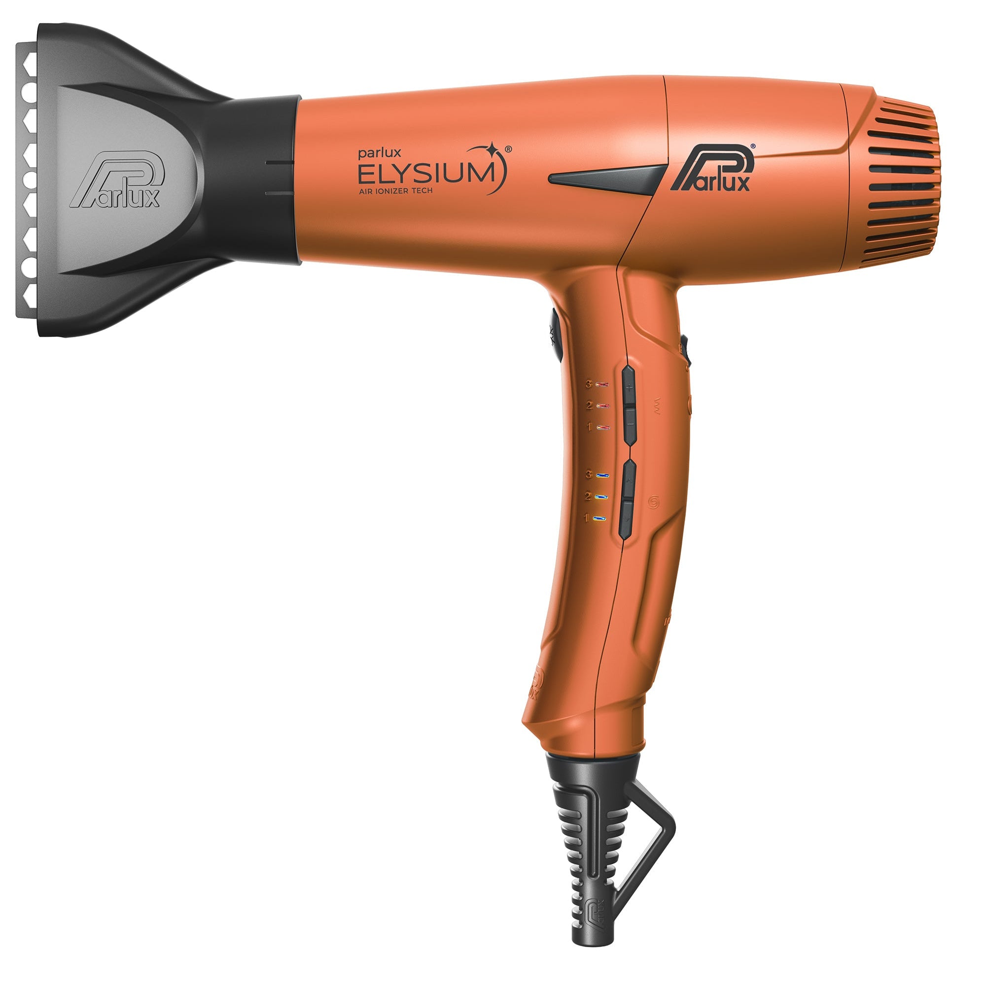 Parlux Elysium® er byltingarkenndur stafrænn hárblásari, hannaður með raunverulegar þarfir fagfólks í huga. Léttur, öflugur og stafrænn hárblásari með 2.300W afli. Ný og nákvæm stafræn stjórntæki, auðveld stjórnun með 9 stillingum, 3 hitastig og 3 hraðastillingar með minni fyrir síðustu stillingu. Frábær fyrir fagfólk, smár í sniði, stór í frammistöðu. Special Twisting Cable snúningssnúra sem snýst frjálslega 360° fyrir hámarks hreyfanleika án þess að flækjast. Loftflæði 80 m³/klst með antiheating húð á framhluta sem kemur í veg fyrir að tækið hitni að framan. Léttur og meðfærilegur, dregur úr álagi í löngum notkunartímum. Hreinsikerfi fyrir auðvelda þrif. Hefðbundin griphönnun fyrir þægilegt og öruggt tak. Air Ionizer Tech jónatækni sem minnkar rafhleðslu og gefur hárinu mýkt og glans. Þrír stútar fylgja með og dreifari. Snúrulengd 3,30 metrar.