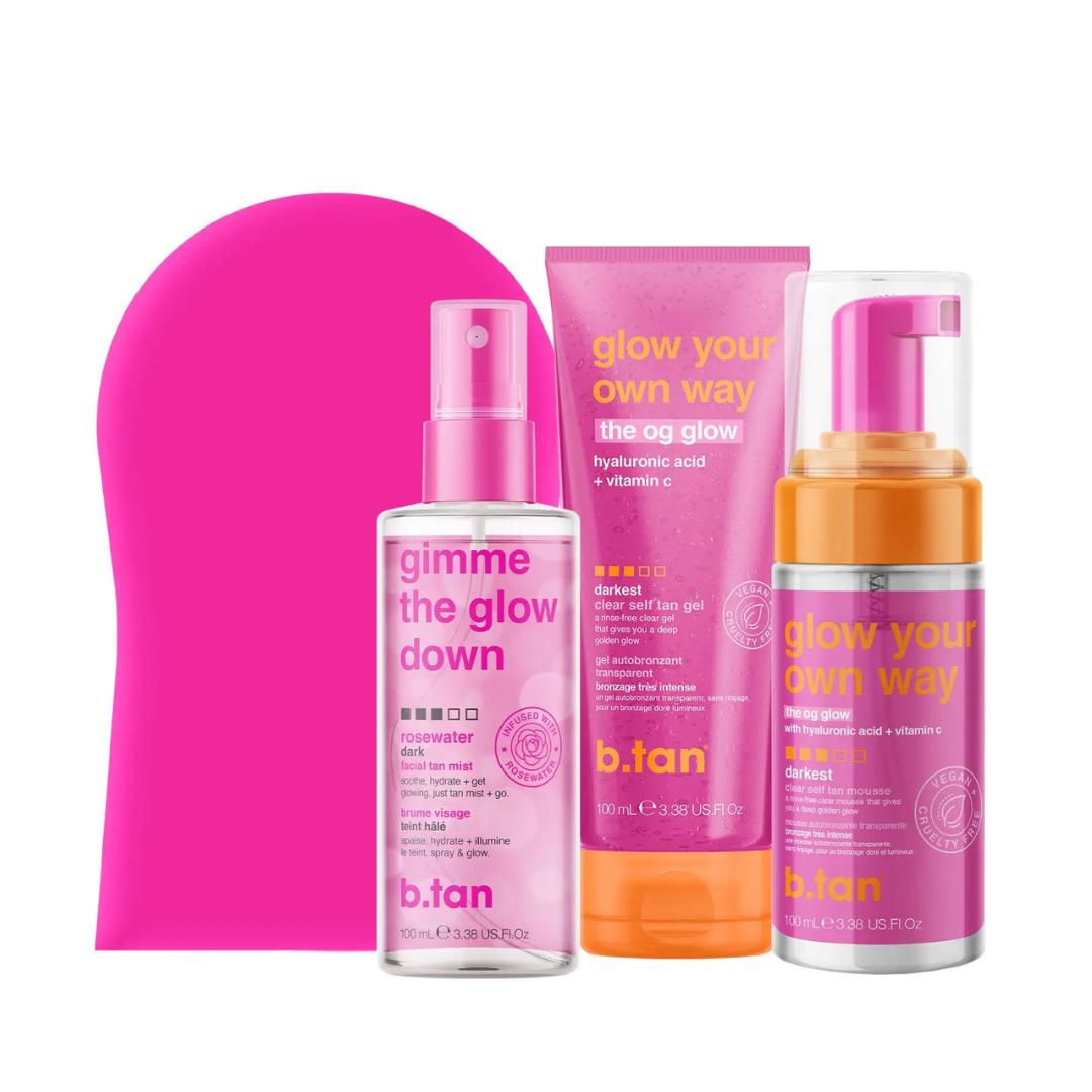 Fallegt gjafasett sem heldur frískleikanum við á ferðalögum. Settið inniheldur Gimme The Glow Down brúnku mist 100ml, Glow Your Own Way sjálfbrúnkugel 100ml, Glow Your Own Way self tan mousse 100ml og brúnku hanska. 100% Vegan, Cruelty og Paraben frítt.