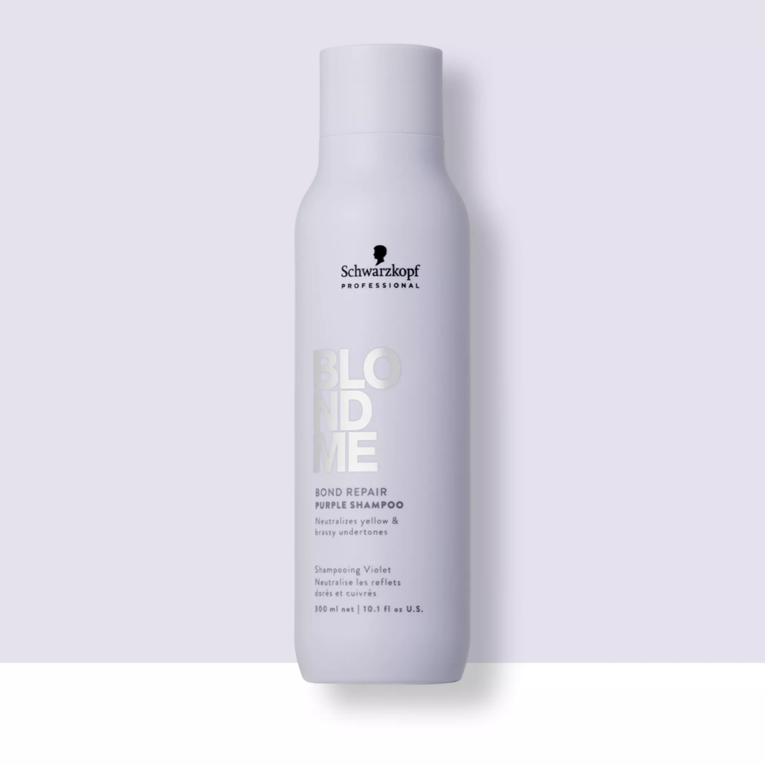 Blondme Bond Repair Purple sjampó dregur úr gulum og hlýju undirtónum í ljósu hári. Súlfatlaus formúla sem hreinsar hárið mildlega án þess að fjarlægja náttúrulegar olíur og raka. Formúlan er auðguð með möndluolíu og kornblómi sem veitir markvisst magn af köldum litarefnum til að viðhalda ferskum, köldum tón og bæta ljósa litinn án þess að breyta hárlitnum. Endurbyggir hárið, kemur í veg fyrir skemmdir og dregur úr að hár brotni um allt að 80%. Tilvalið fyrir aflitað, litað eða náttúrulega ljóst hár. Vegan sjampó og PETA vottuð hárumhirða.