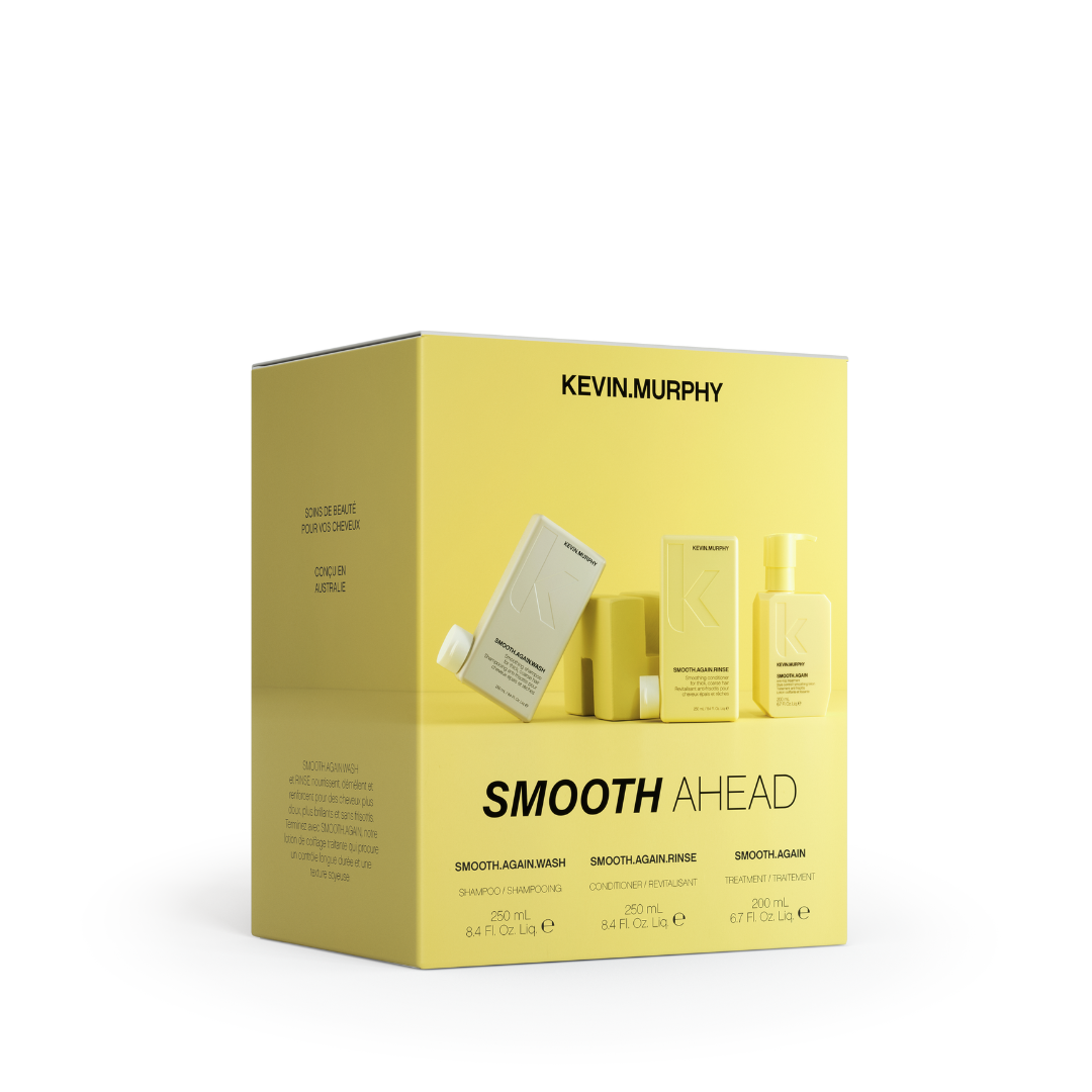 Kevin Murphy Smooth Ahead Gjafasettið er hin fullkomna rútína fyrir þykkt, gróft eða úfið hár sem þarfnast mýktar, stjórnunar og gljáa. Þetta faglega sett inniheldur Smooth Agin sjampó 250ml, Smooth Agin Rise hárnæringu 250ml ásamt Smooth Agin Leave In Treatment.