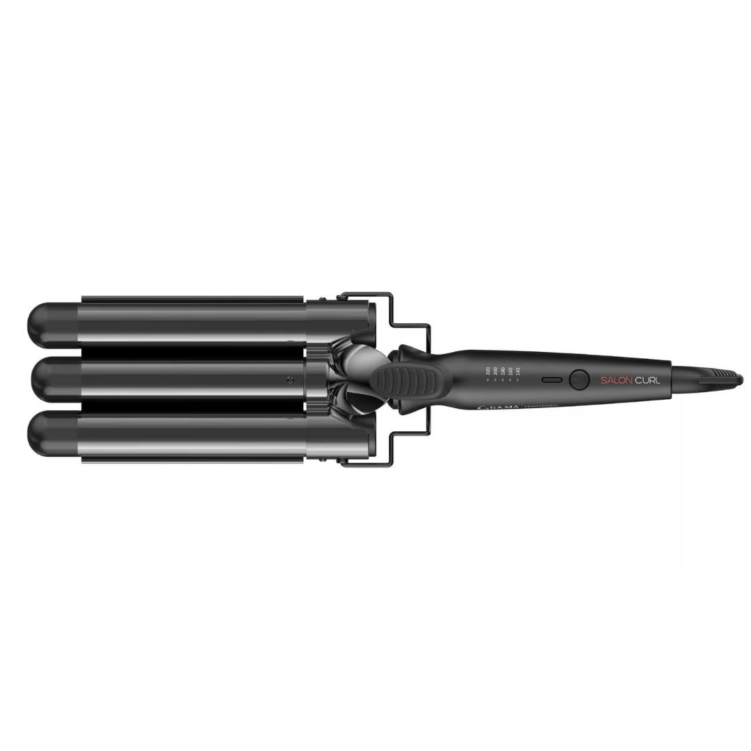 Salon Curl Triple Barrel krullujárnið sameinar faglega frammistöðu og háþróaða hárvernd sem gefur hárinu fullkomnar strandbylgjur á auðveldan hátt. Það er með þremur 25 mm hlaupum og 170mm löngum fyrir auðvelda notkun. Silk Chrome títanhúðun og Nano Silver tækni, sem skapa fullkomlega mótaðar og heilbrigðar bylgjur, hárið helst mjúkt og glansandi. Tækið er fljótt að hitna með sérsniðnu hitastigi fyrir allar hárgerðið frá 140°C til 220°C. LED skjár, slekkur sjálft á sér efitr 60 mínútur án notkunnar. 3 metra löng snúningssnúra.