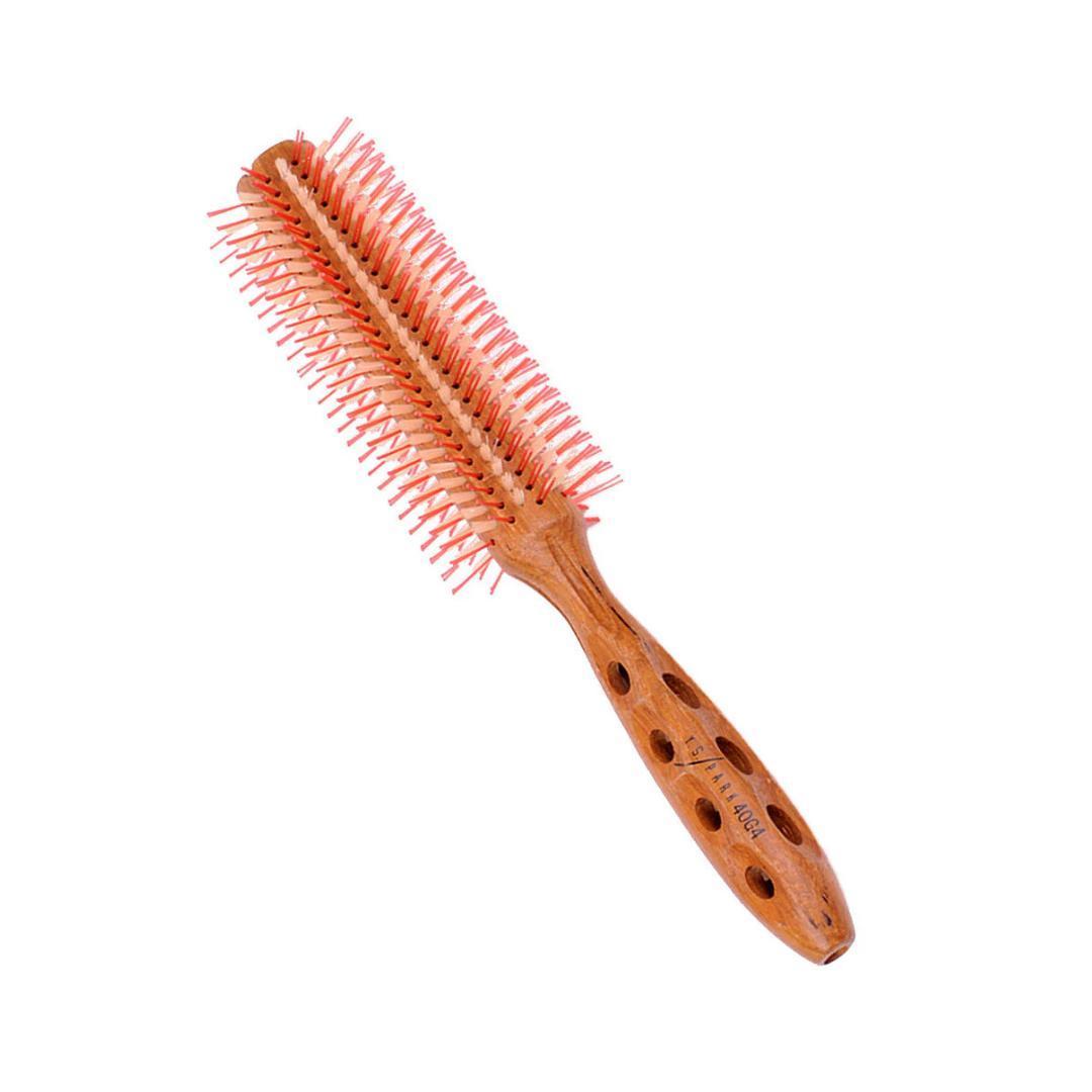 42mm hringbursti framleiddur úr náttúrulegum teak viði og hannað með bæði svínshár og hitaþolnum nælonpinnum í röðum til skiptis. Leyfðu 5 cm bili á milli þurrkarastúts og bursta til að leyfa heitu lofti að streyma í gegnum burstann og streyma um hárið til að þurrka vel án hitaskemmda á burstanum eða hárinu. Ef það er ekki gert mun það brenna náttúrulegu svínshárin. Ekki láta burstann liggja í vökva, þar sem það getur valdið sprungum í náttúrulega viðinum.
