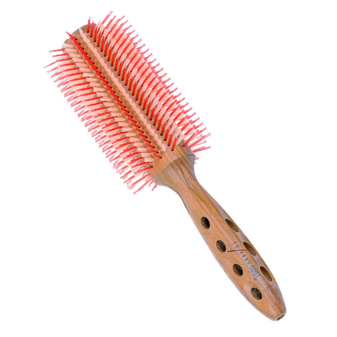 Framleitt úr náttúrulegum teak viði og hannaður með bæði svínshár og hitaþolnum nylon pinnum í röðum til skiptis. Leyfðu 5 cm bili á milli þurrkarastúts og bursta til að leyfa heitu lofti að streyma í gegnum burstann og streyma um hárið til að þurrka vel án hitaskemmda á burstanum eða hárinu. Ef það er ekki gert mun það brenna náttúrulegu svínshárin. Ekki láta burstann liggja í vökva, þar sem það getur valdið sprungum í náttúrulega viðnum.